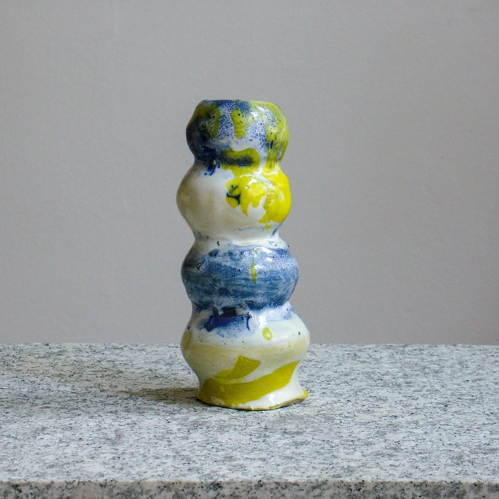 Kerstin Stoll stellt bei ihren farbintensiven Vasen den prozessualen Aspekt der Arbeit mit Ton in den Vordergrund. In unzähligen Testreihen hat sie herausgefunden, wie man die Lauffähigkeit von Feldspat beeinflußten kann.Wann fängt der Feldspat an zu laufen, wann bleibt er in tropfartigen Gebilden auf dem Untergrund stehen, wann bildet er dicke Materialblasen?