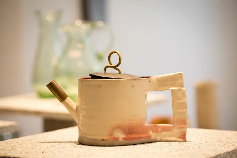 Eine von Hand bemalte Schale des Berliner Keramikers Pit Arens. Die Schale ist auf der Außenseite reich bemalt und im Inneren mit einer Figur versehen.